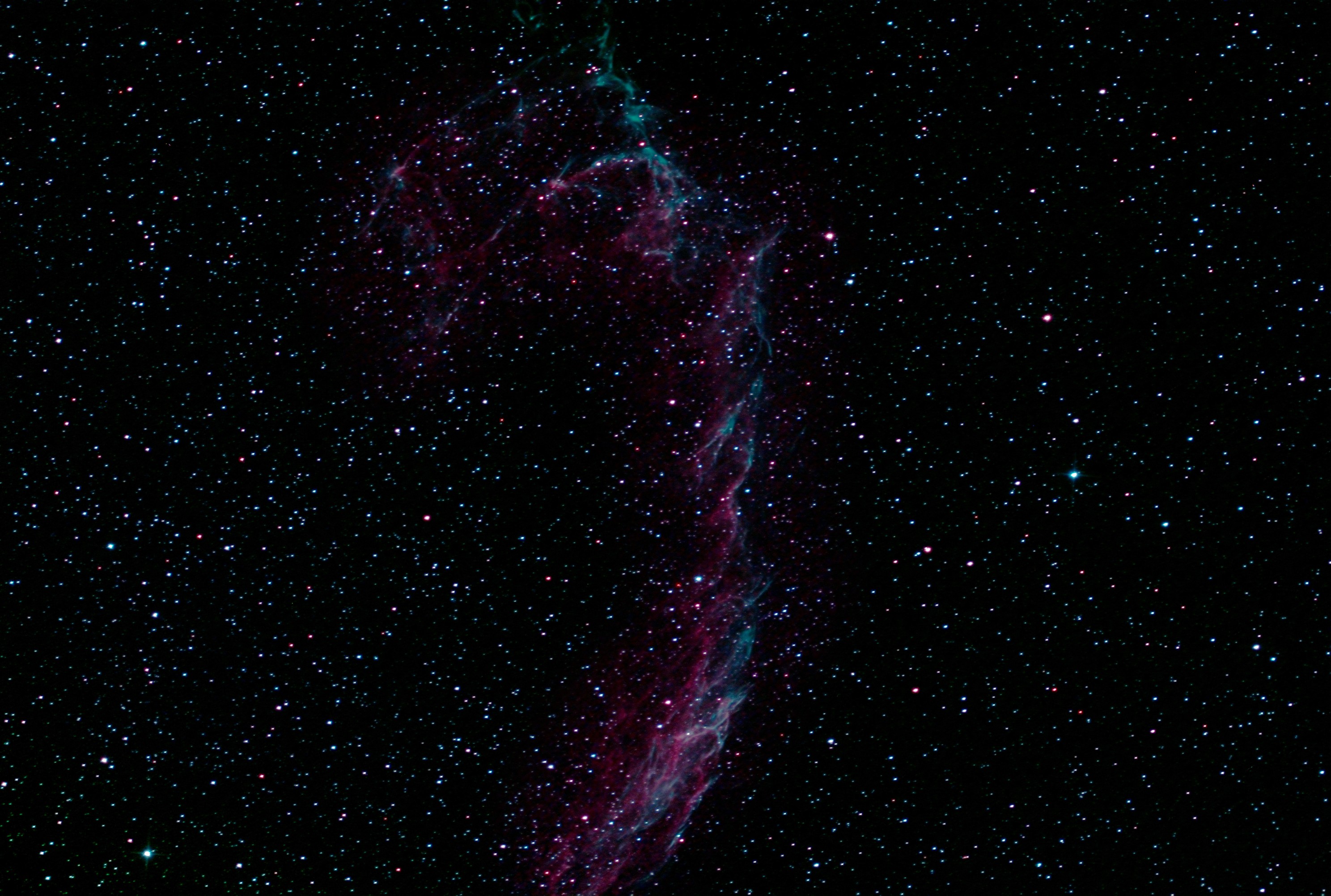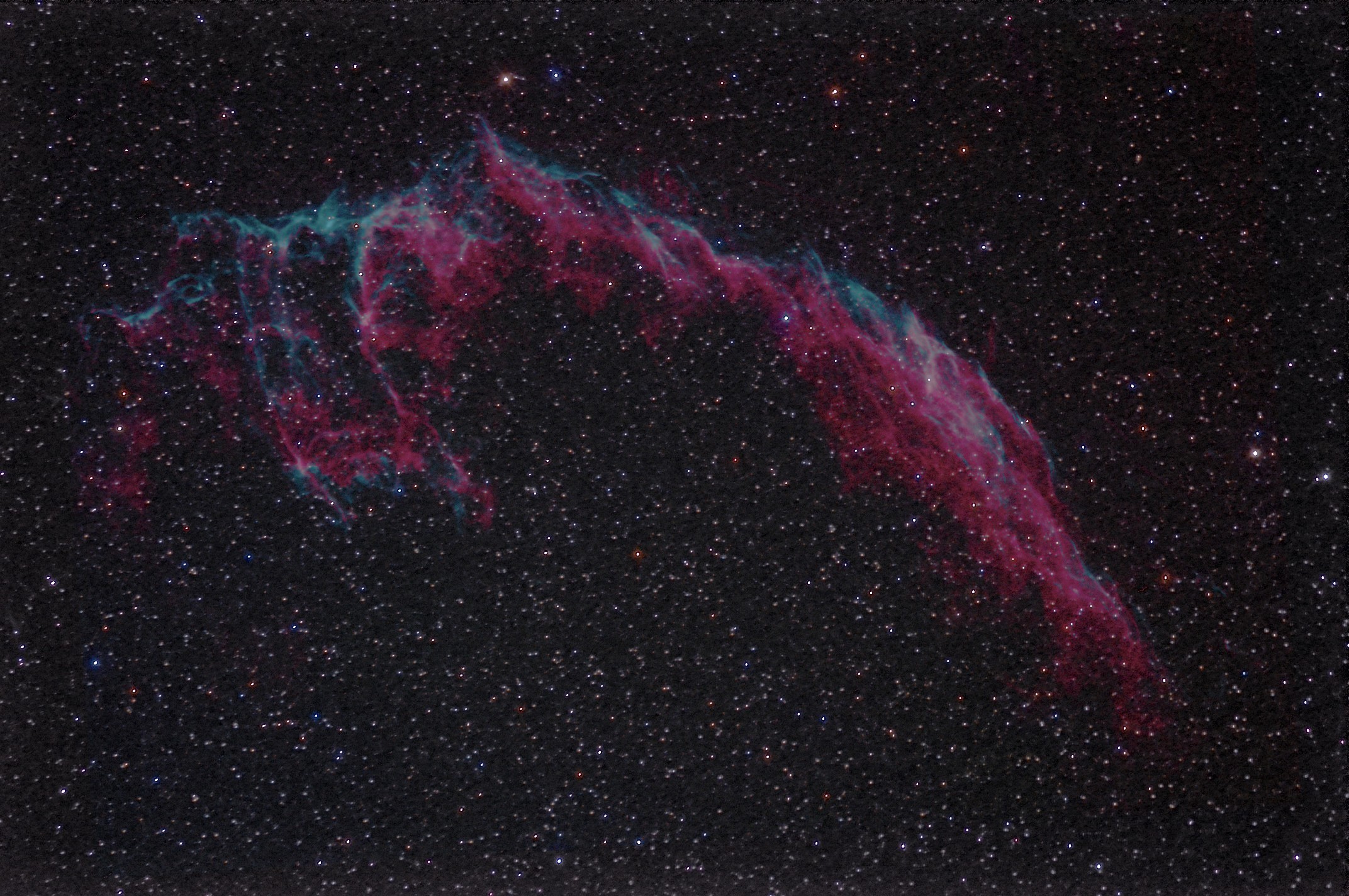 NGC 6992 - Teil des Cirrusnebels ca. 18000 Jahre alter Supernovarest im Sternbild Schwan Skywatcher 200/1000, HEQ-5 Pro, Komakorrektor, PEC-Training, Fokalprojektion, Nikon D90, Schmalbandfilter, 15x60s, ISO800, 19.10.2014 |