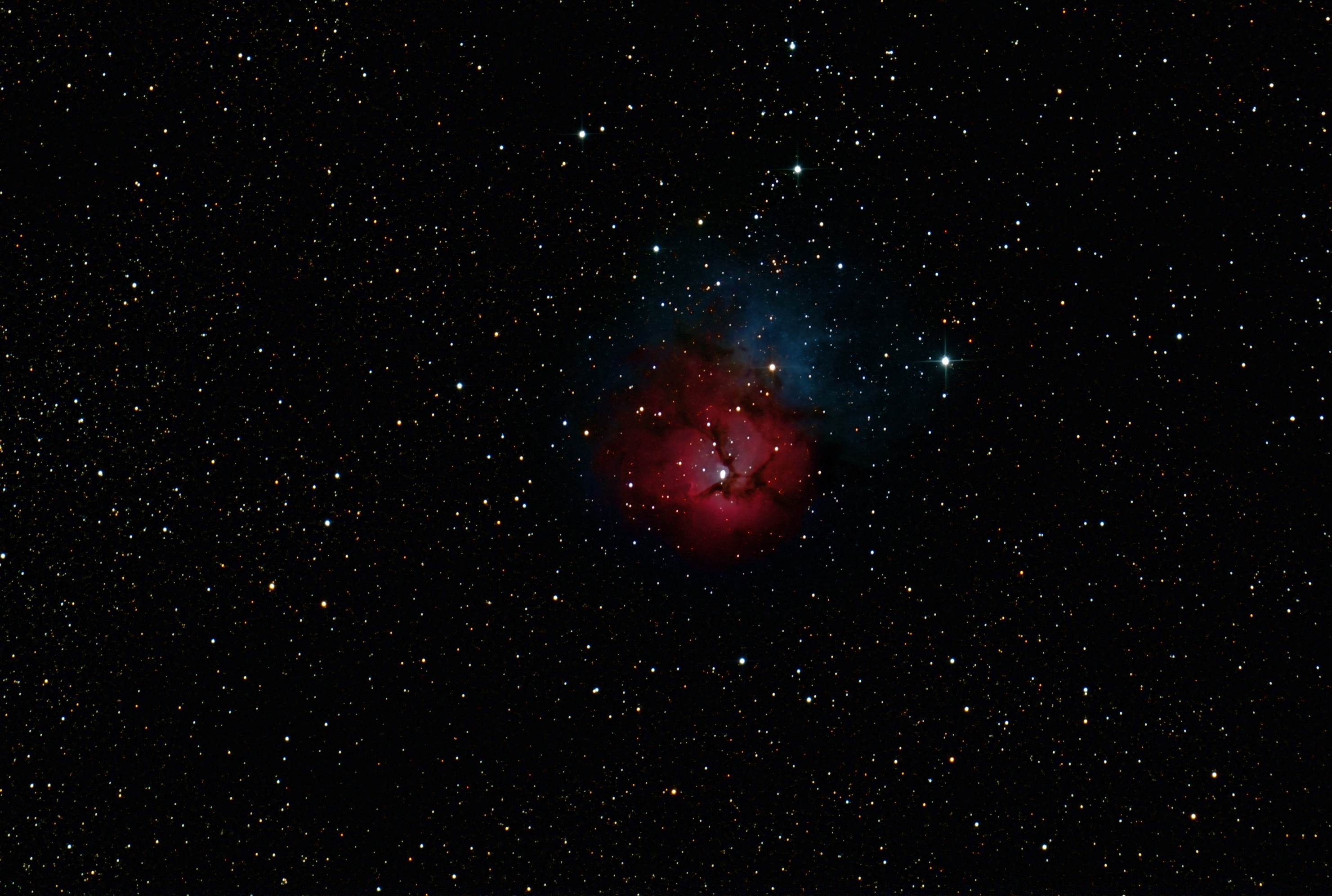 M 20 - Trifidnebel, Emissions- und Reflexionsnebel im Sternbild Schütze. Skywatcher 200/1000, HEQ-5 Pro, Komakorrektor, Fokalprojektion, Nikon D5200, 21x30s, ISO800, 02.07.2014