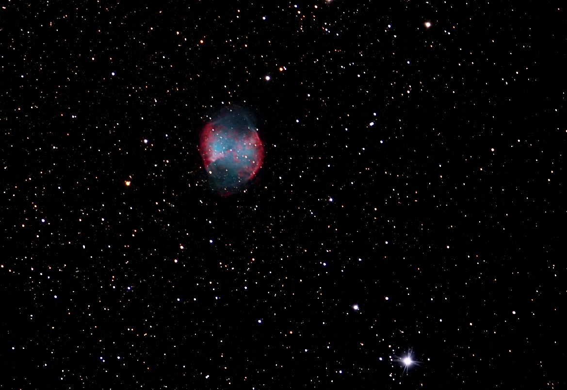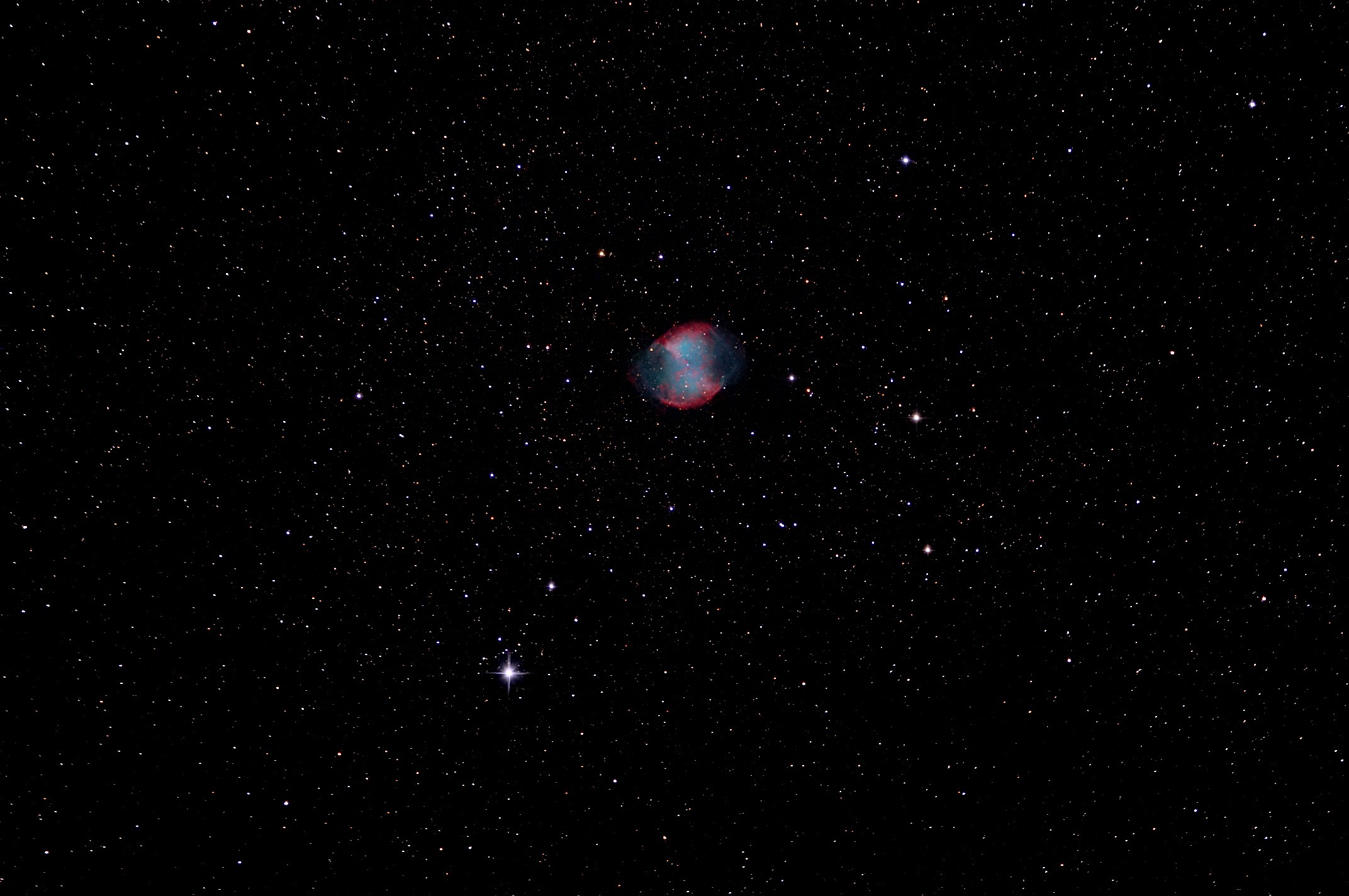 M 27 - Hantelnebel im Sternbild Fuchs (Planetarischer Nebel) Skywatcher 200/1000, HEQ-5 Pro, Komakorrektor, Fokalprojektion, Nikon D90, 11x60s, ISO800, 16.08.2013