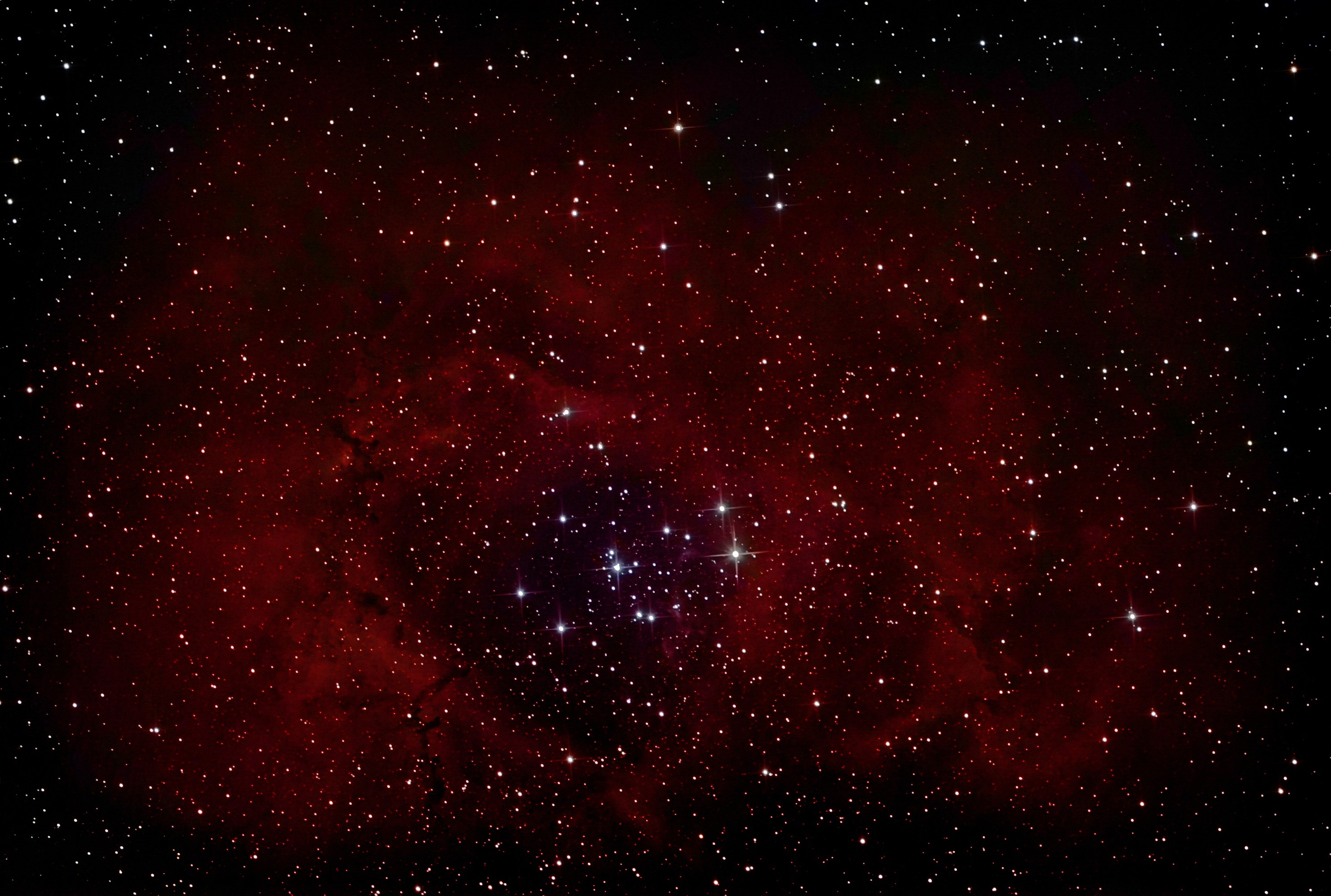 NGC 2237 - Rosettennebel im Sternbild Einhorn (Emissionsnebel) Der offene Sternhaufen NGC 2244 bringt den Nebel zum Leuchten. Skywatcher 200/1000, HEQ-5 Pro, Komakorrektor, Fokalprojektion, Nikon D5200, 30x60s, ISO800, 23.02.2014 |
