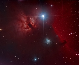 NGC 2024 - Flammennebel und IC 434, zwei Emissionsnebel Der Pferdekopfnebel Barnard 33 ist eine Dunkelwolke vor IC 434. Skywatcher 200/1000, HEQ-5 Pro, Fokalprojektion, Nikon D90, 16x60s, ISO800, 13.01.2013 |