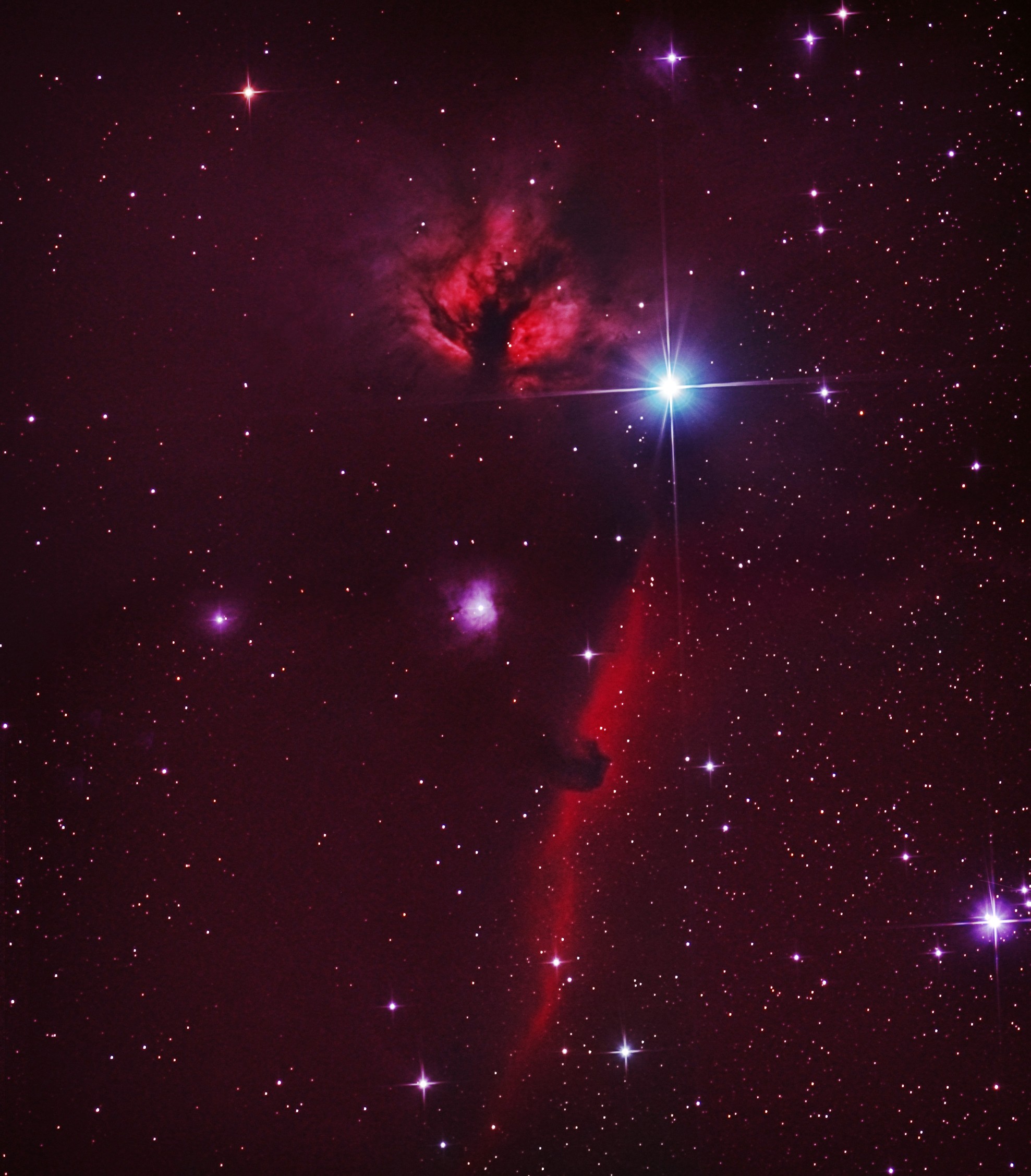 Emissionsnebel IC 434 mit Pferdekopfnebel (Barnard 33) und Flammennebel NGC 2024 Skywatcher 200/1000, HEQ-5 Pro, Komakorrektor, Fokalprojektion, Nikon 5200, 69x60s, ISO800, 30.12.2016