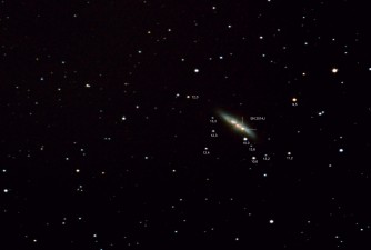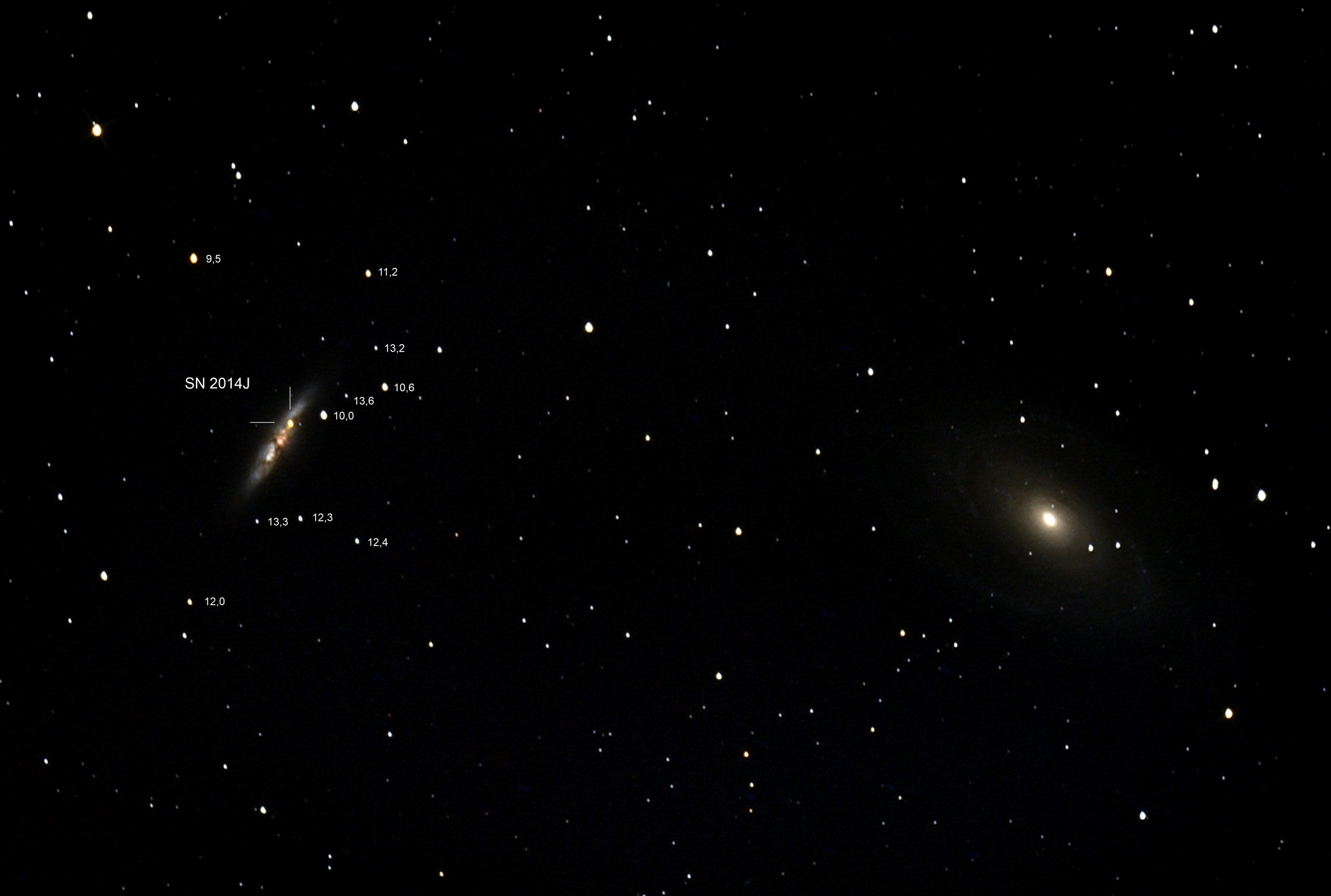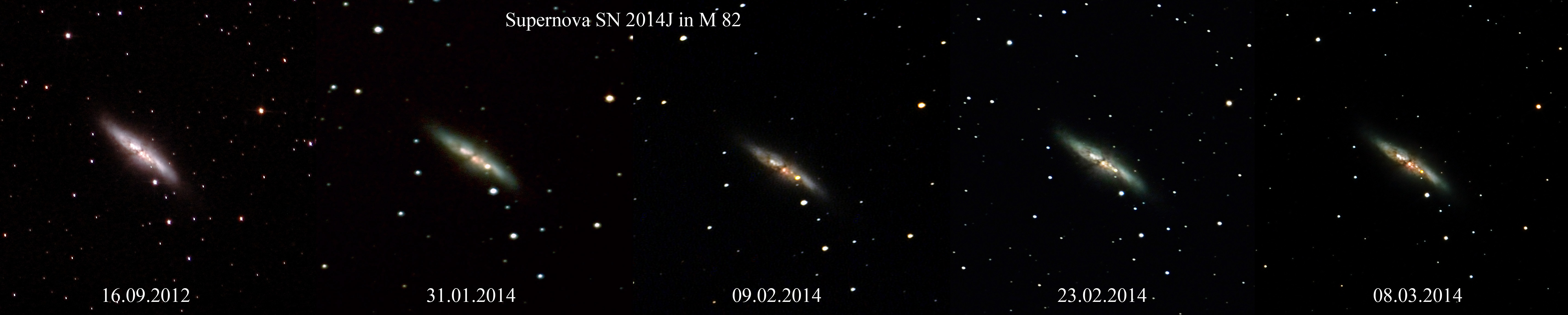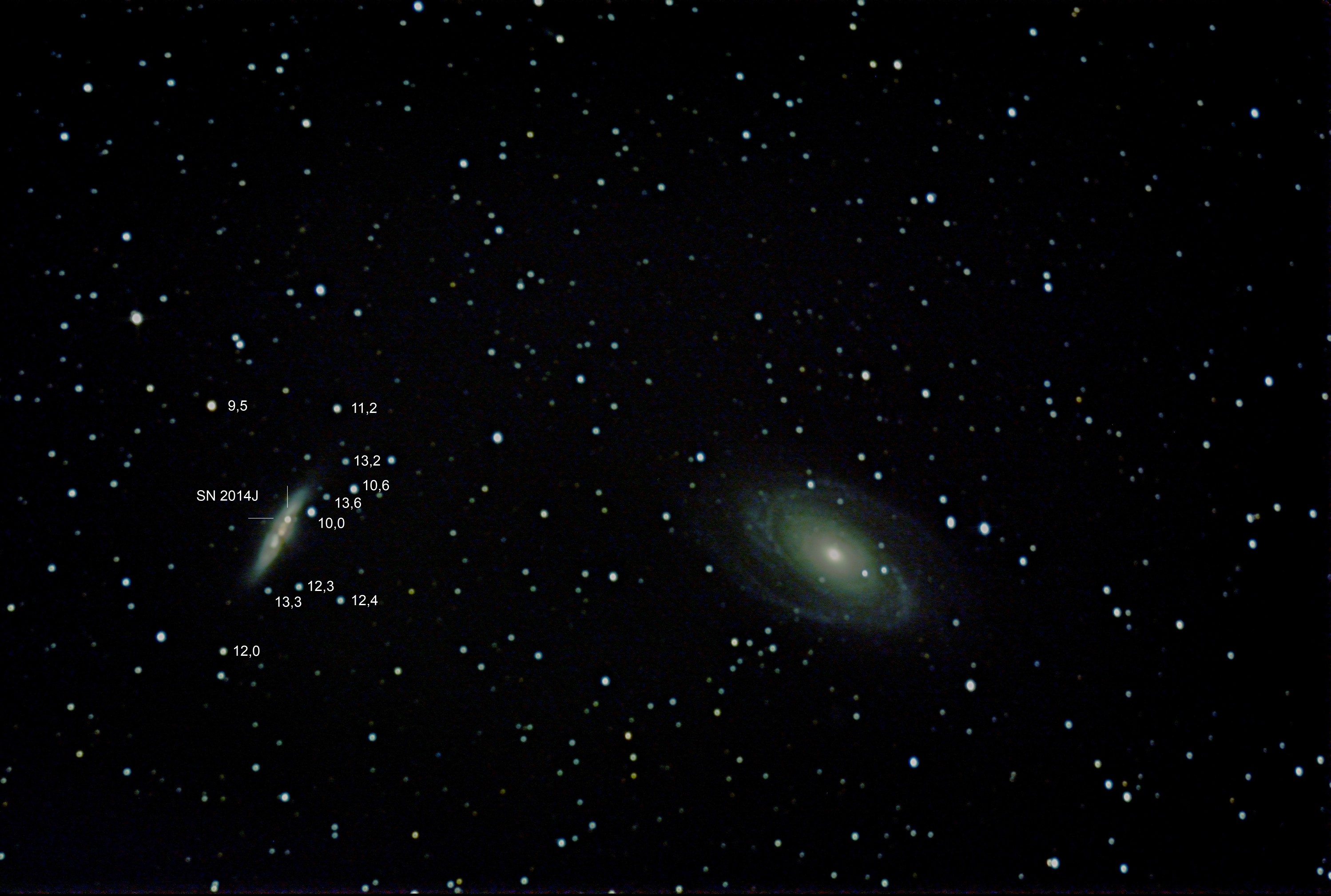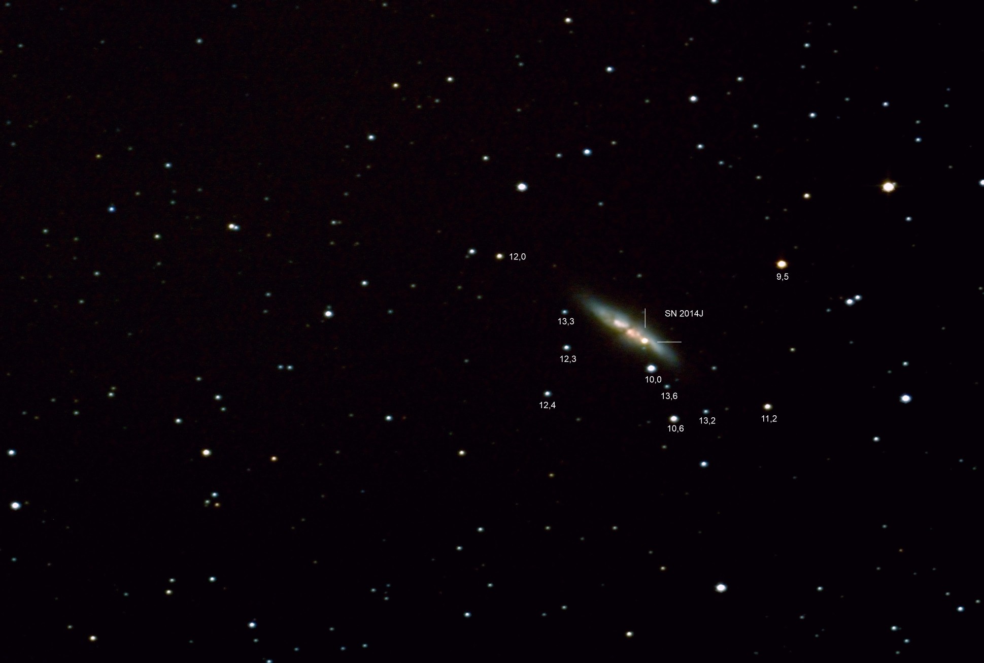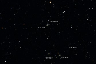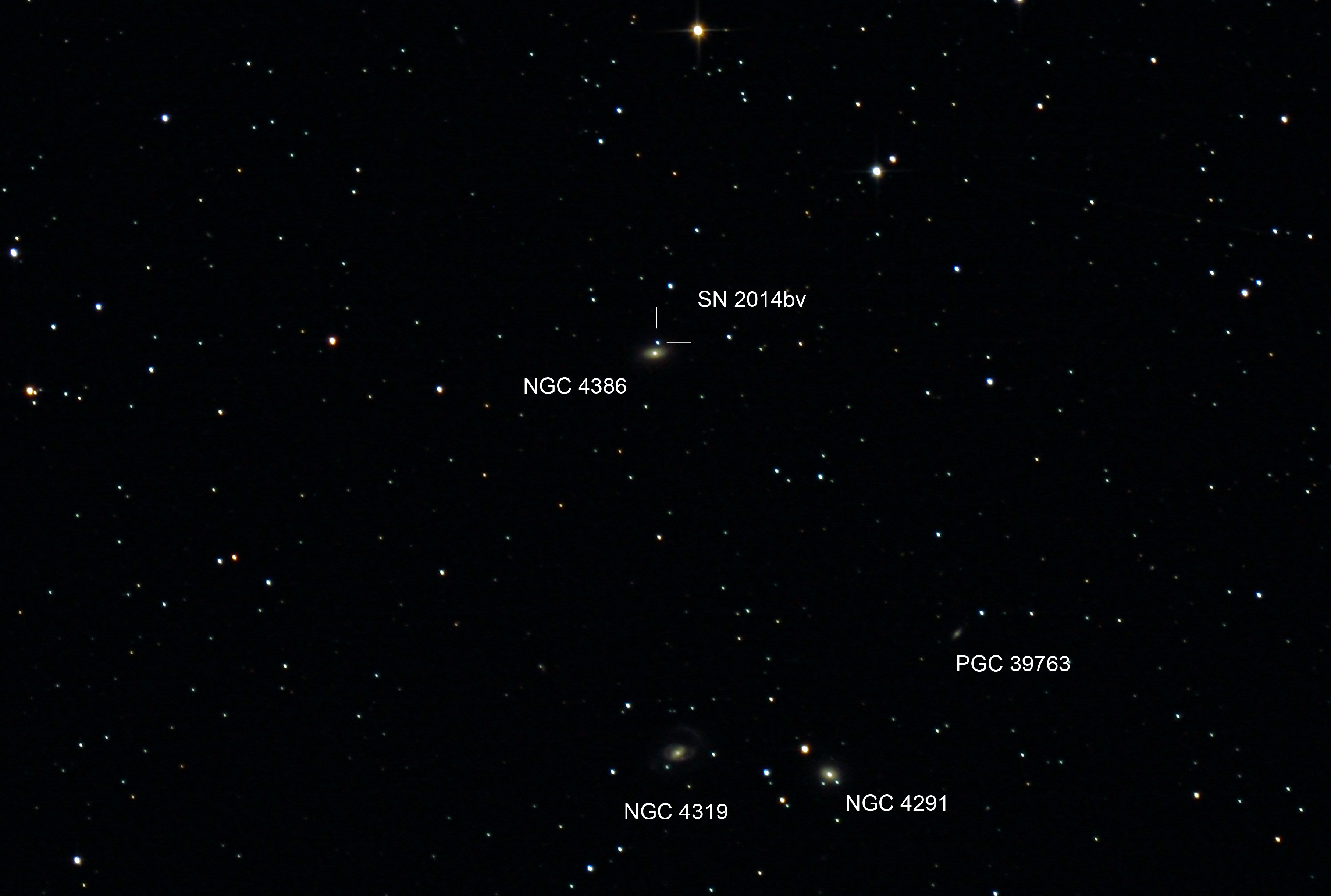 | SN 2014bv - Supernova in NGC 4386, aufgenommen am 03.07.2014 Skywatcher 200/1000, HEQ-5 Pro, Komakorrektor, Fokalprojektion, Nikon D5200, 20x30s, ISO800, 03.07.2014 |