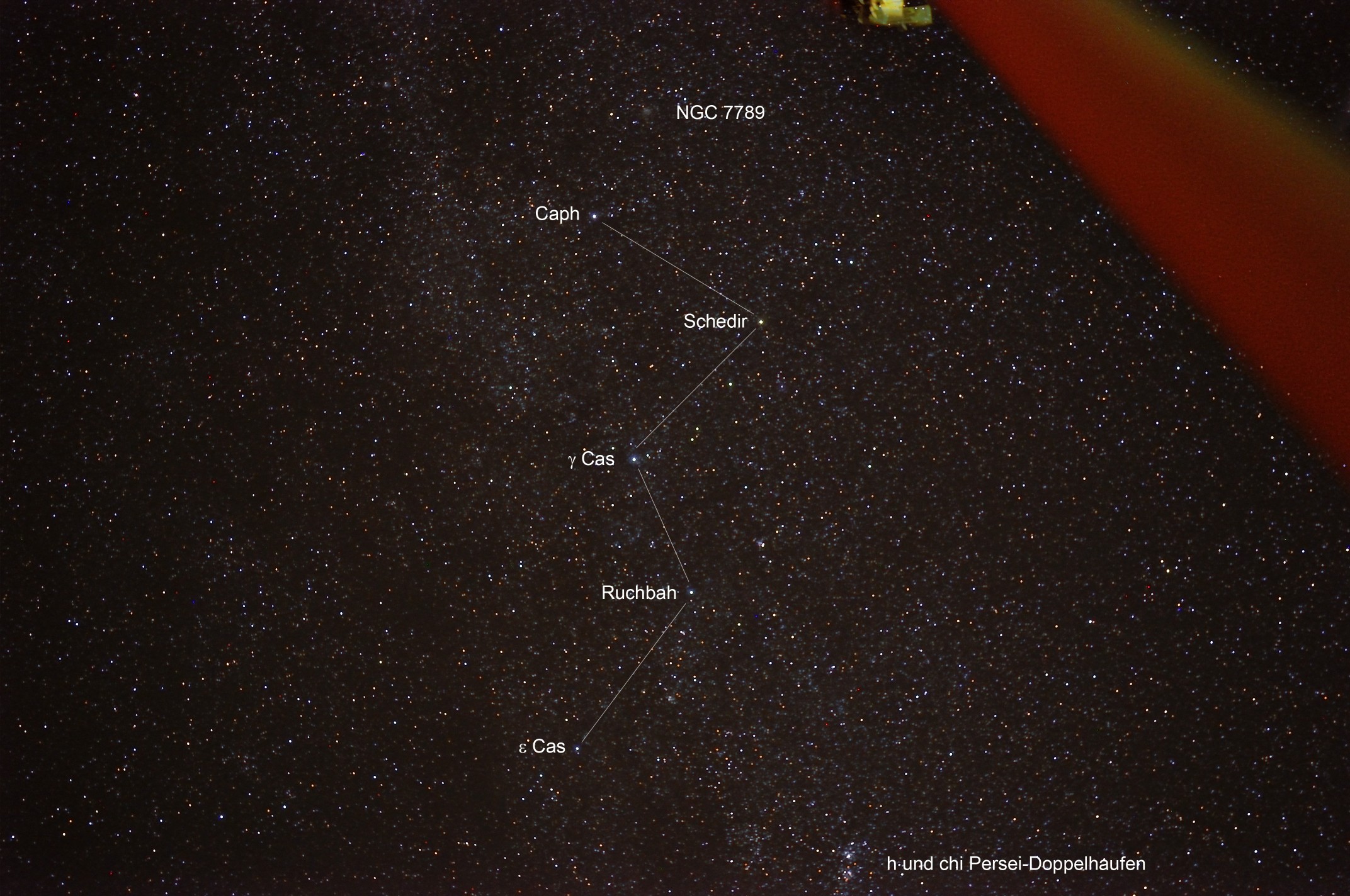 Kassiopeia-Region mit Beschreibung Nikon D90, 40 mm, f/5.3, ISO 800, 7x60 s, 19.10.2014 |