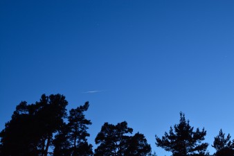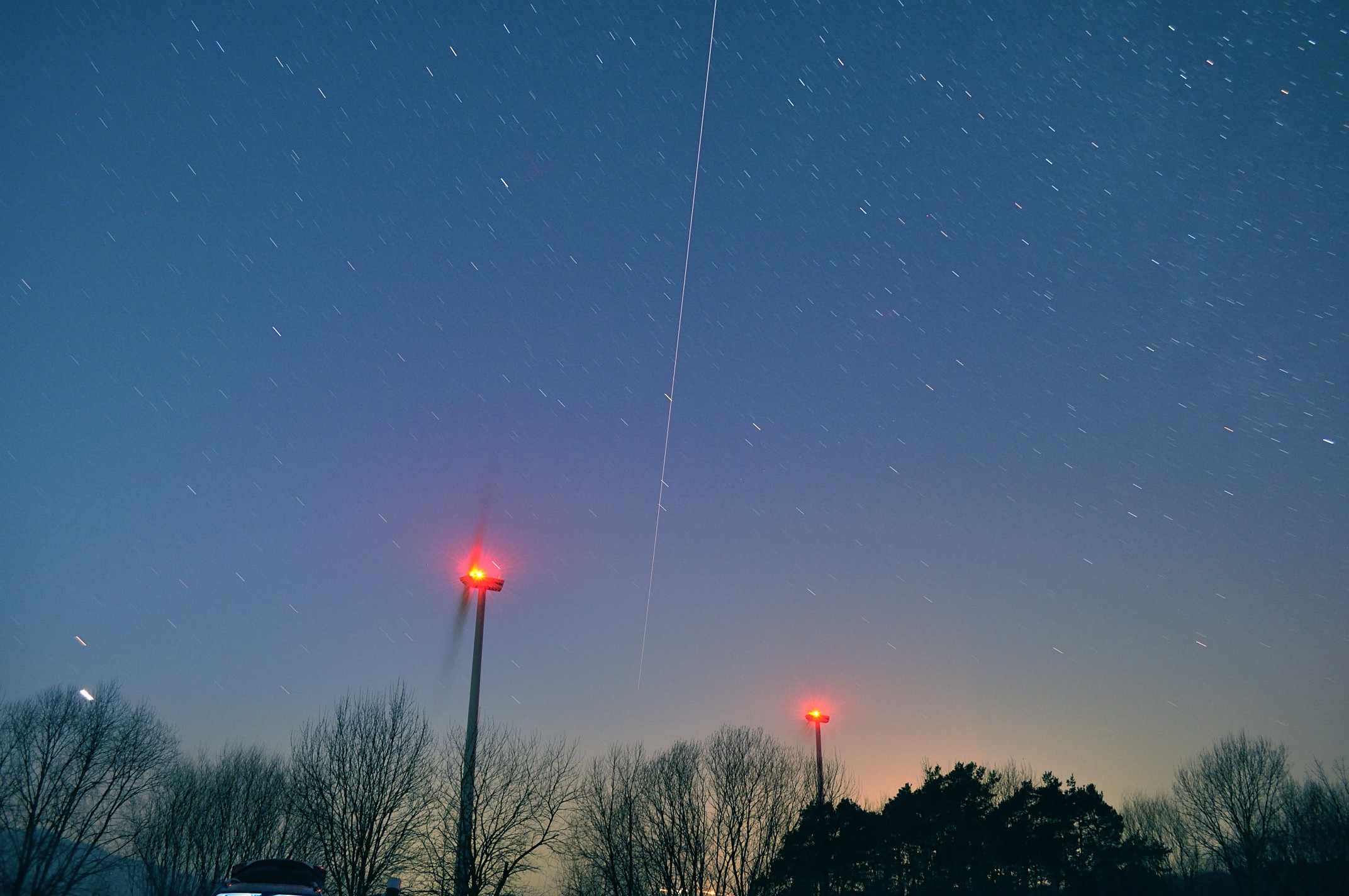 ISS Überflug am 16.02.2015 um 19:00 Uhr im Westen, links über den Bäumen Venus und Mars, Nikon D90, 18 mm, 2 min 17 s, ISO800, Blende f/5.6 |