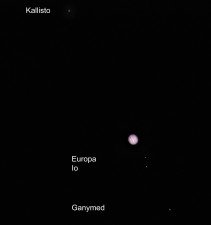 Jupiter am 08.03.2014 um 22:25 Uhr (Io-Jupiter)-Europa-Ganymed-Kallisto, v.l.n.r. Skywatcher N 200/1000, HEQ-5 Pro, Komakorrektor, Fokalprojektion, Nikon D5200, Montage aus über- und unterbelichteten Bildern |