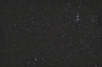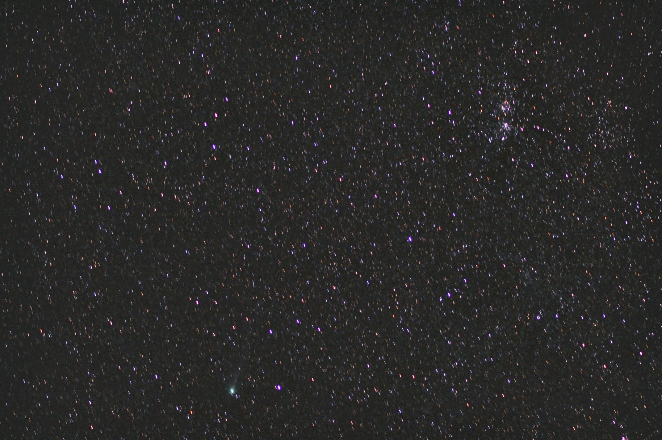 C/2014 Q2 - Lovejoy am 16.02.2015, 20:05 Uhr MEZ, oben rechts Doppelsternhaufen h und chi Persei, Nikon D90, 85 mm, 1x20s, ISO800, f/1.8 |