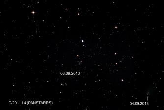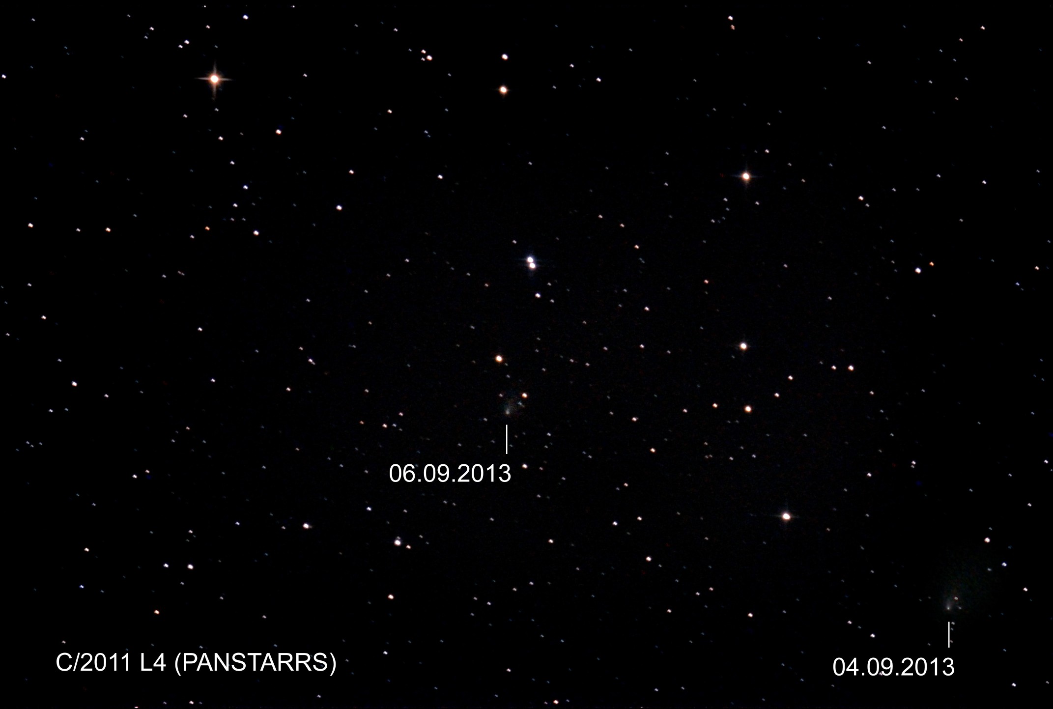 C/2011 L4 - PanSTARRS am 04. und 06.09.2013 Skywatcher N 200/1000, HEQ-5 Pro, Komakorrektor, Fokalprojektion, Nikon D90, 10x60s, ISO800 |