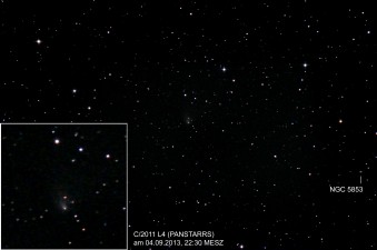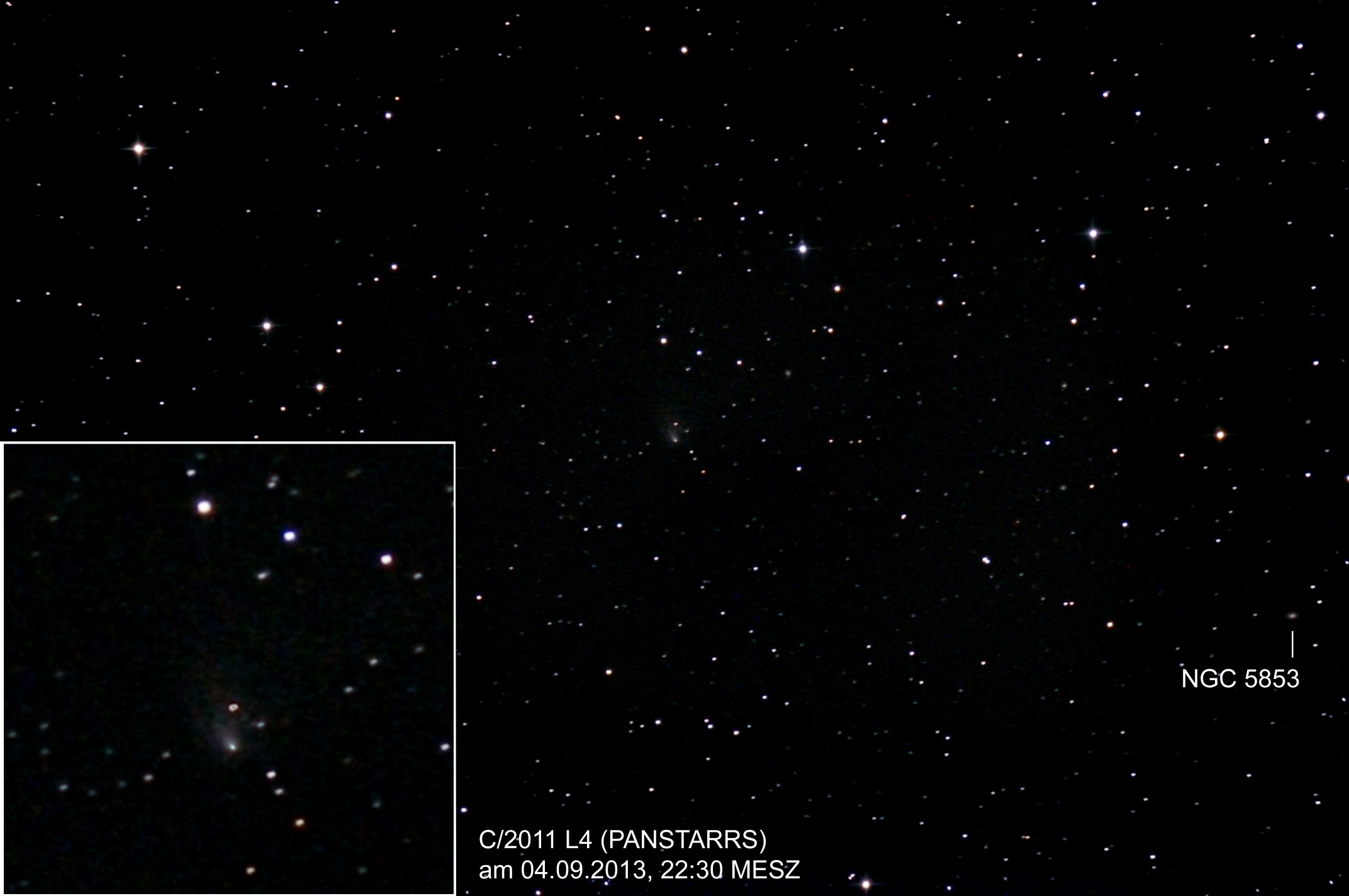 C/2011 L4 - PanSTARRS am 04.9.2013 Skywatcher N 200/1000, HEQ-5 Pro, Komakorrektor, Fokalprojektion, Nikon D90, 10x60s, ISO800 |